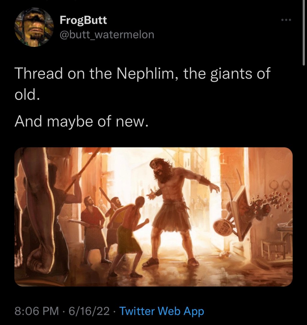 Thread on the Nephlim, the giants of old. And maybe of new. pic.twitter.com/RqA792YSZ7— FrogButt (@butt_watermelon) June 17, 2022