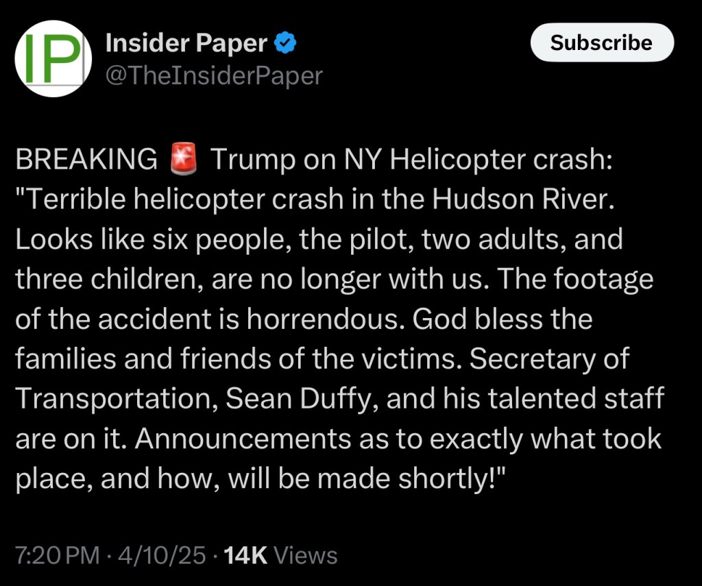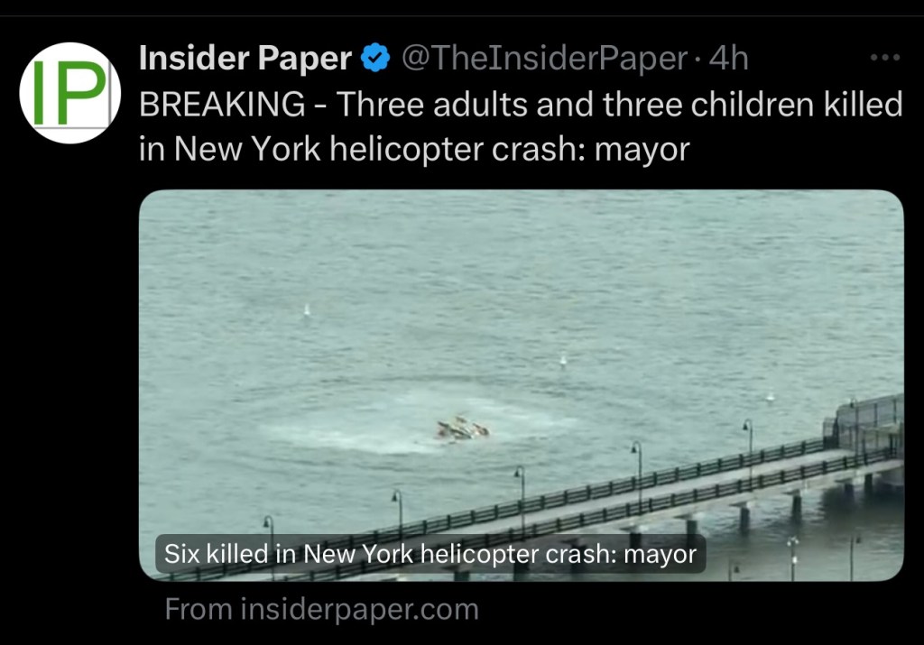 BREAKING: Six people have died in a helicopter crash in the Hudson River in New York City — AP pic.twitter.com/yIdr9vYVkb— Insider Paper (@TheInsiderPaper) April 10, 2025