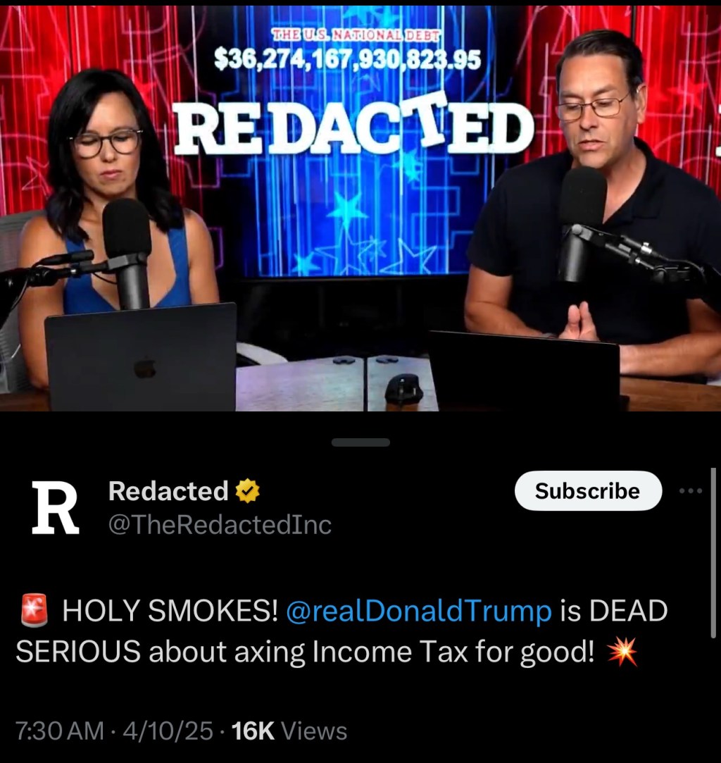 🚨 HOLY SMOKES! @realDonaldTrump is DEAD SERIOUS about axing Income Tax for good! 💥 pic.twitter.com/fYsd7ihrfJ— Redacted (@TheRedactedInc) April 10, 2025