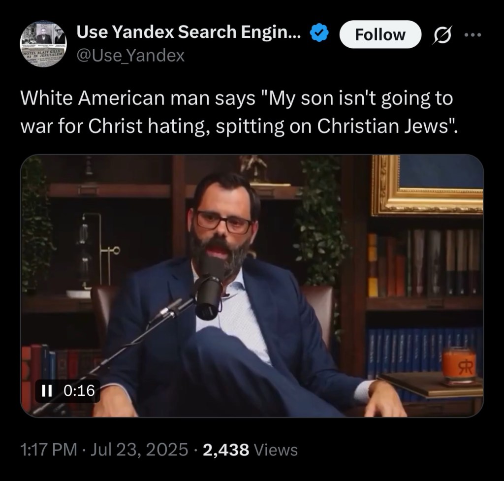 White American man says "My son isn't going to war for Christ hating, spitting on Christian Jews". pic.twitter.com/SMI7yVfqh8— Use Yandex Search Engine for Anti Zionist searches (@Use_Yandex) July 23, 2025