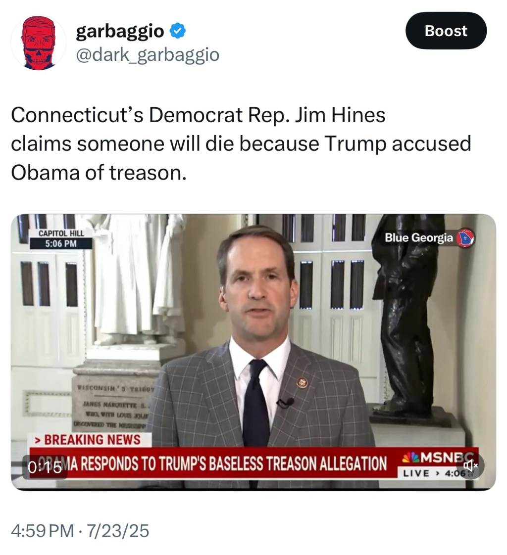 Connecticut’s Democrat Rep. Jim Hines claims someone will die because Trump accused Obama of treason. pic.twitter.com/eINLVbRnRy