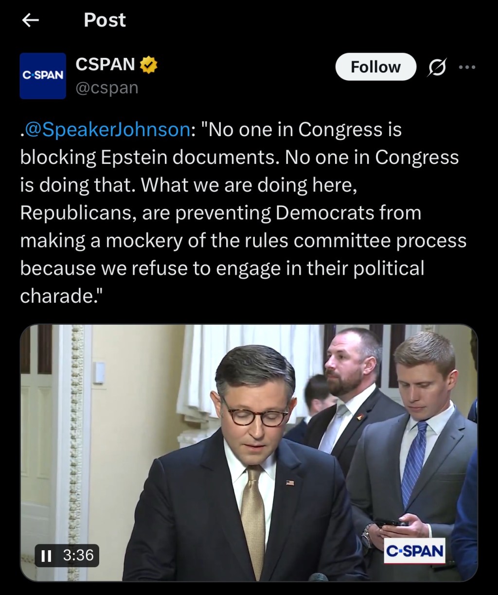 .@SpeakerJohnson: "No one in Congress is blocking Epstein documents. No one in Congress is doing that. What we are doing here, Republicans, are preventing Democrats from making a mockery of the rules committee process because we refuse to engage in their political charade." pic.twitter.com/JbZDyCdc1o
