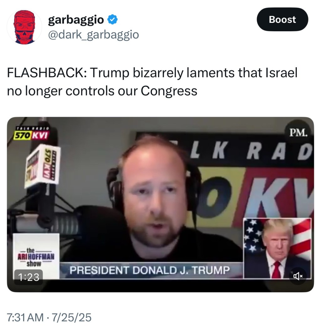 FLASHBACK: Trump bizarrely laments that Israel no longer controls our Congress pic.twitter.com/tBgCp8CTqT— garbaggio (@dark_garbaggio) July 25, 2025