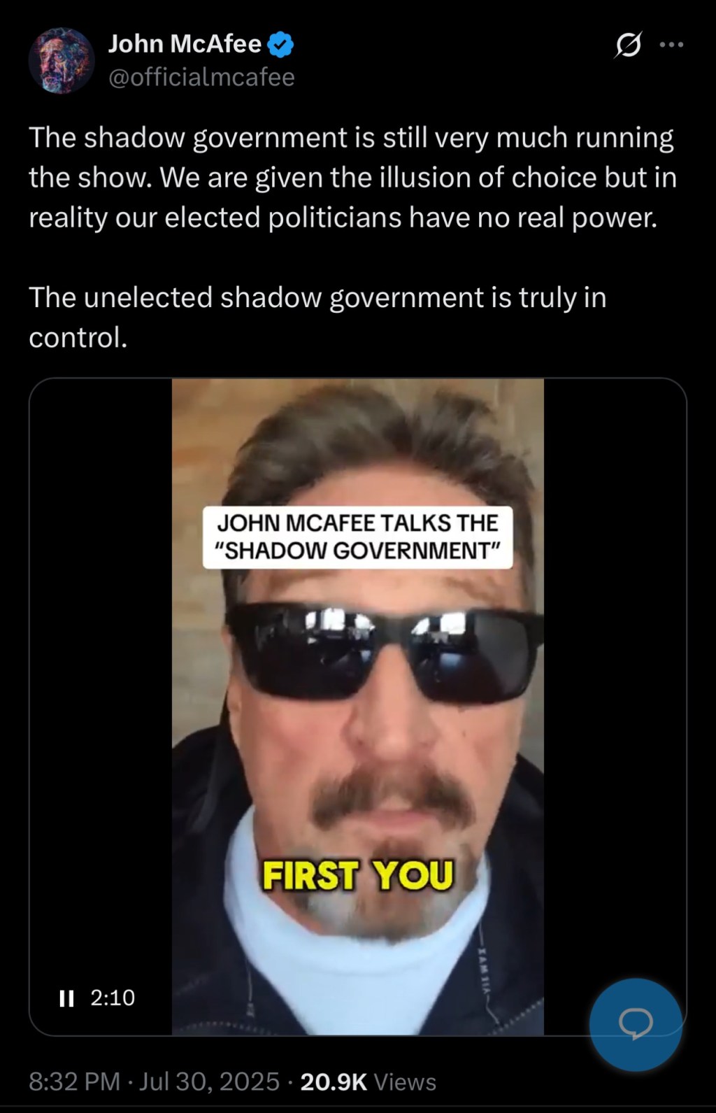 — John McAfee (@officialmcafee) July 31, 2025