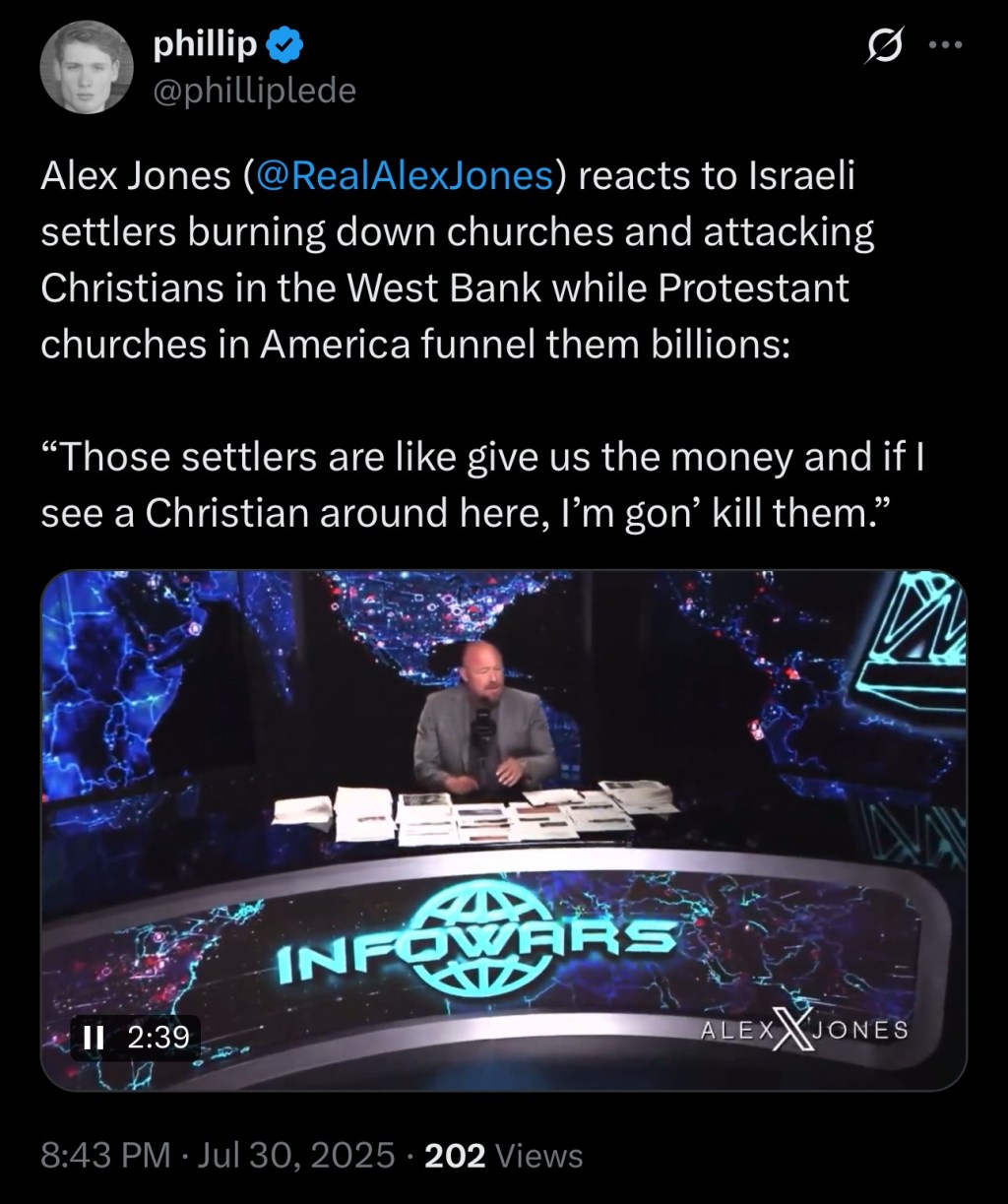Alex Jones (@RealAlexJones) reacts to Israeli settlers burning down churches and attacking Christians in the West Bank while Protestant churches in America funnel them billions:
