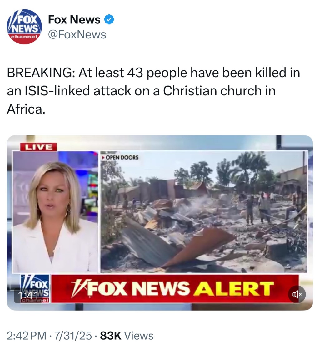 BREAKING: At least 43 people have been killed in an ISIS-linked attack on a Christian church in Africa. pic.twitter.com/EoSWXjQuVf