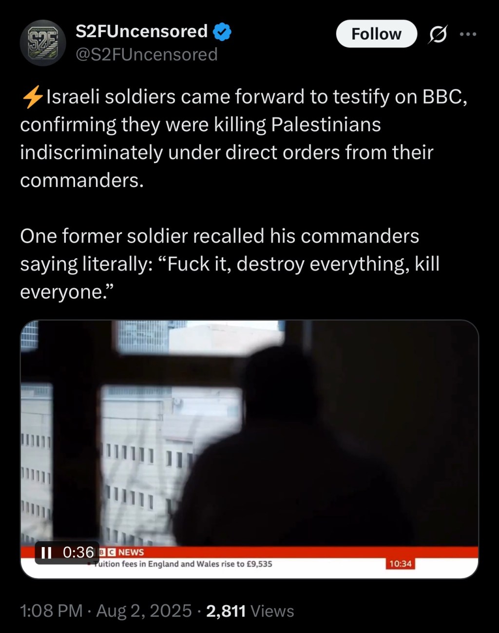 ⚡️Israeli soldiers came forward to testify on BBC, confirming they were killing Palestinians indiscriminately under direct orders from their commanders.