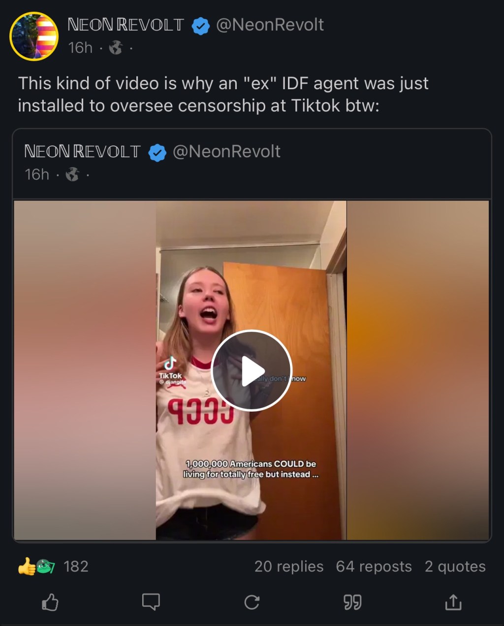 This kind of video is why an “ex” IDF agent was just installed to oversee censorship at Tiktok btw: