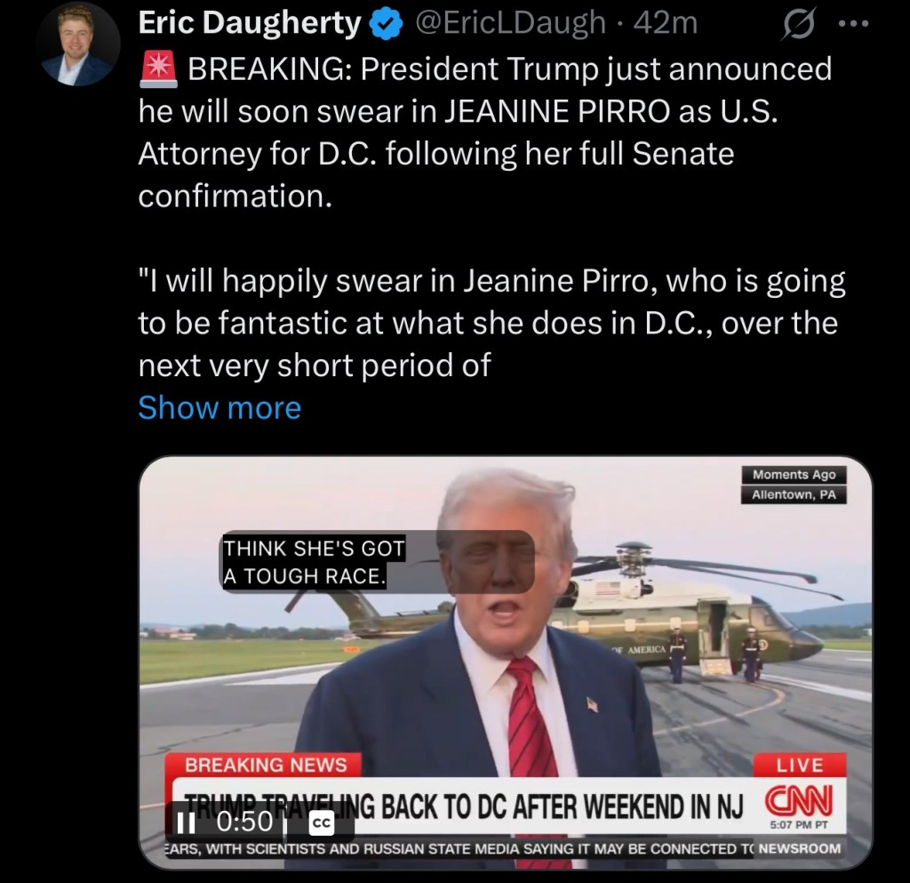 🚨 BREAKING: President Trump just announced he will soon swear in JEANINE PIRRO as U.S. Attorney for D.C. following her full Senate confirmation.