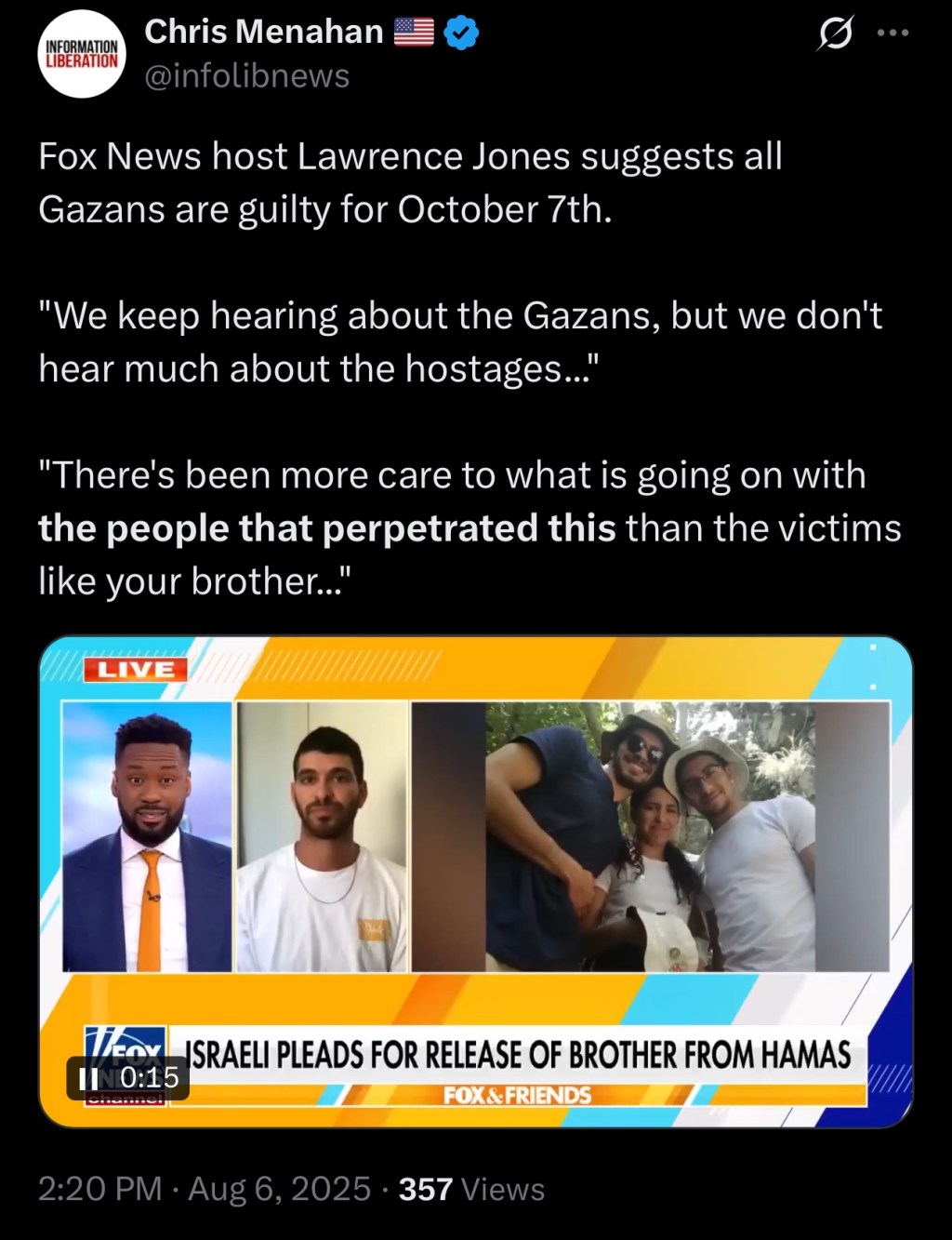 Fox News host Lawrence Jones suggests all Gazans are guilty for October 7th.
