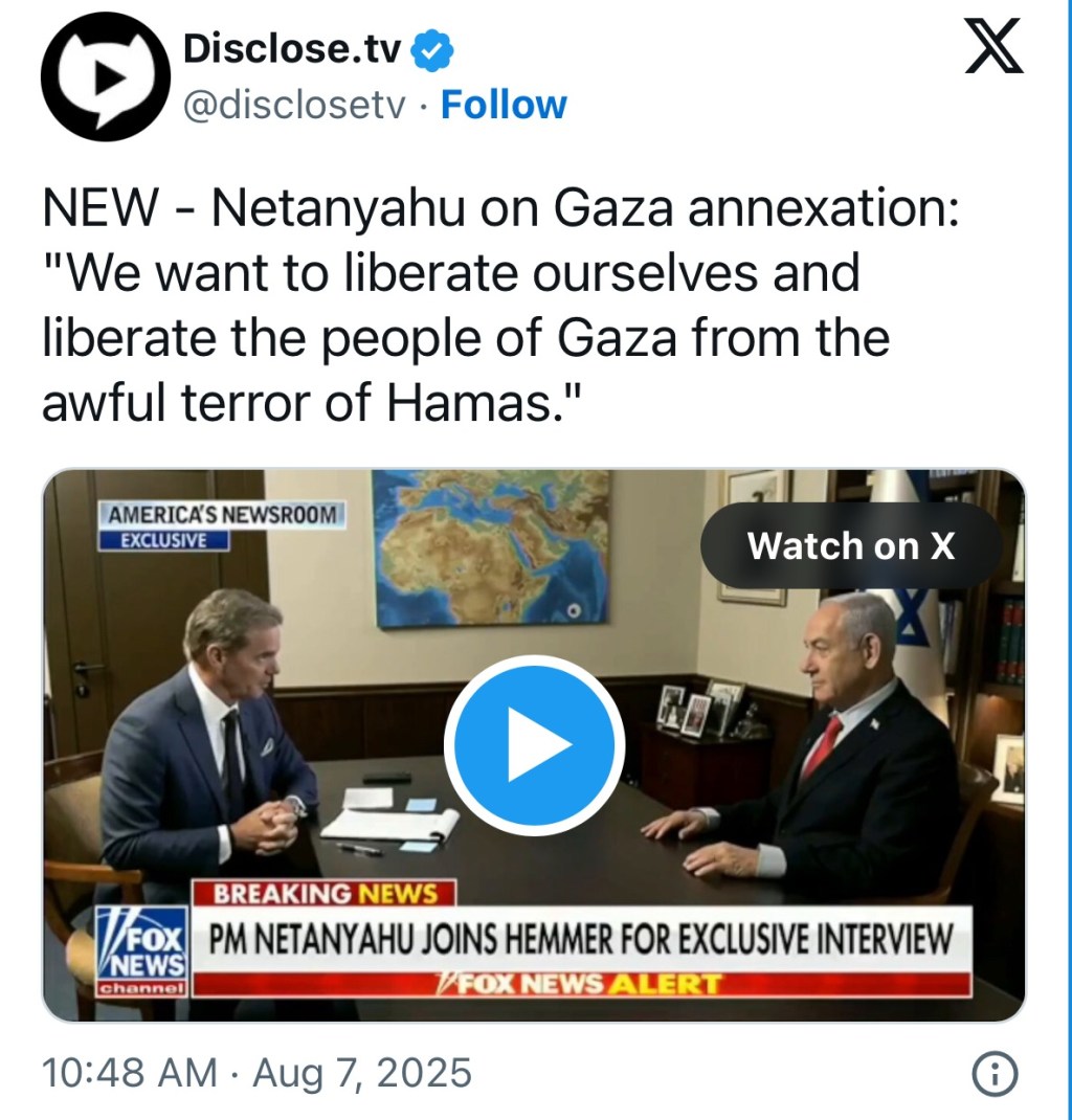 NEW – Netanyahu on Gaza annexation: "We want to liberate ourselves and liberate the people of Gaza from the awful terror of Hamas." pic.twitter.com/aEt2SvY2K7— Disclose.tv (@disclosetv) August 7, 2025