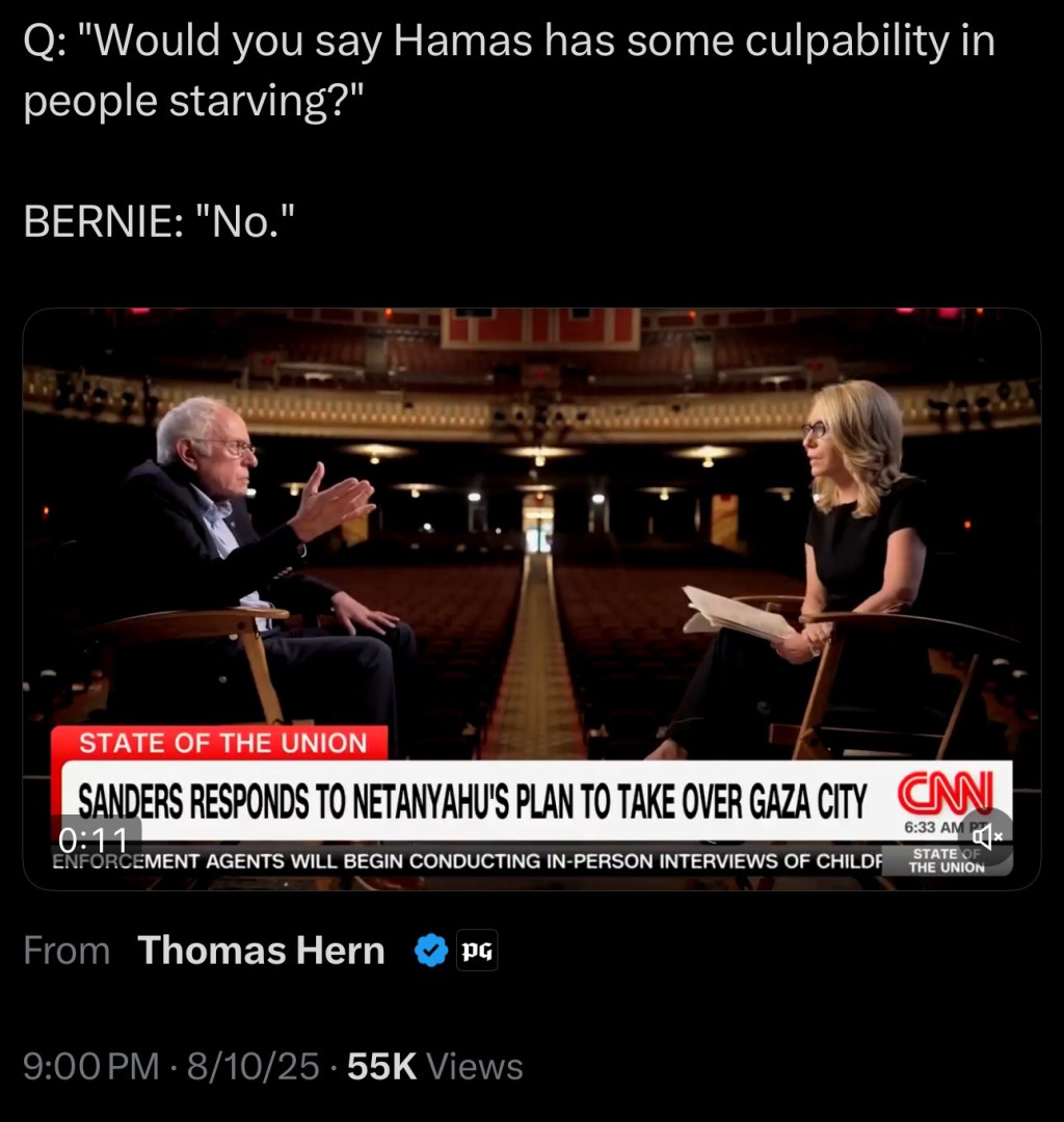 Q: "Would you say Hamas has some culpability in people starving?"BERNIE: "No." pic.twitter.com/XZRKlrpqy6— Breaking911 (@Breaking911) August 11, 2025