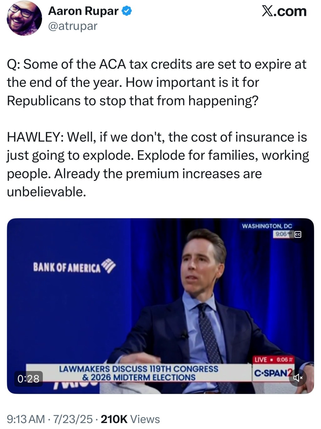 HAWLEY: Well, if we don't, the cost of insurance is just going to explode. Explode for families, working people. Already the premium… pic.twitter.com/wg5Z8cxDsH
