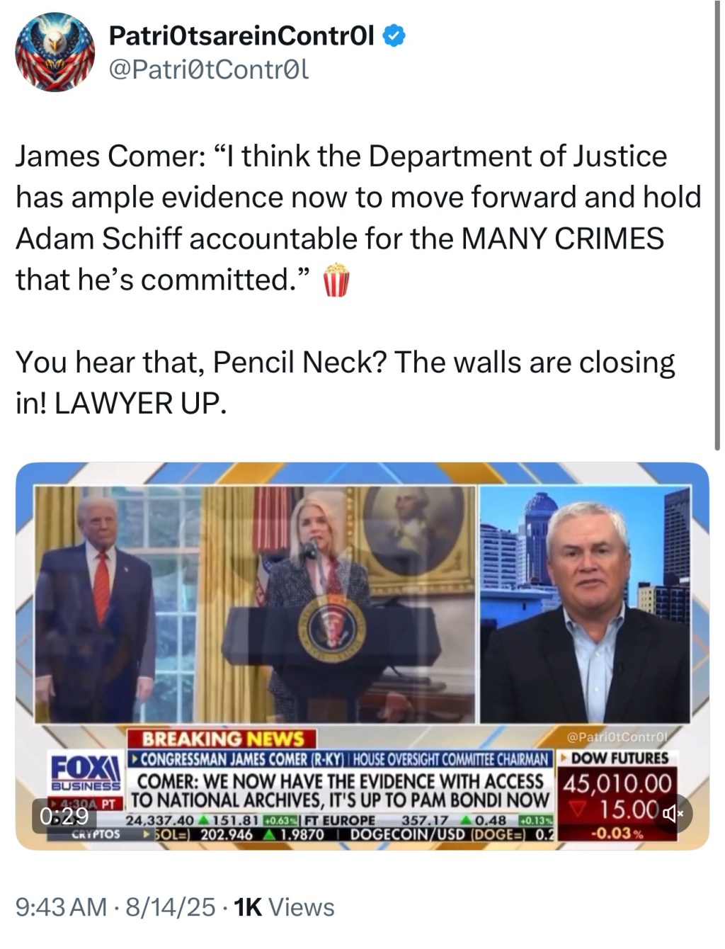 James Comer: “I think the Department of Justice has ample evidence now to move forward and hold Adam Schiff accountable for the MANY CRIMES that he’s committed.” 🍿