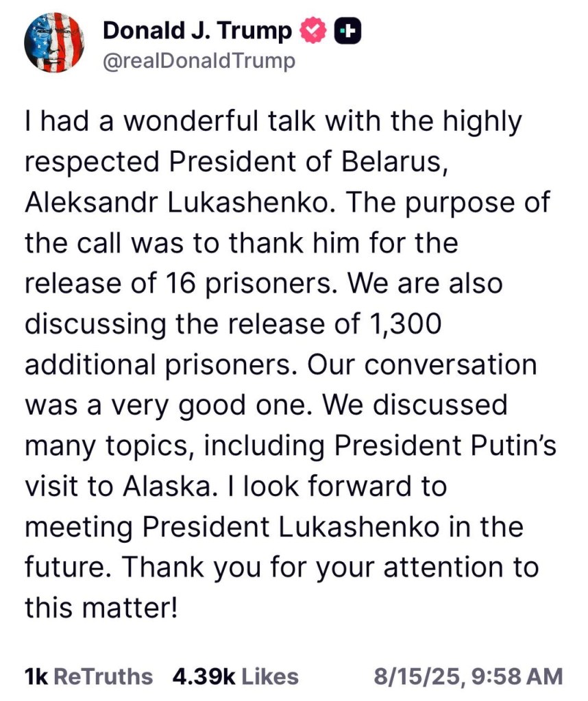 JUST IN – Trump speaks with Belarus' Lukashenko en route to Alaska, looks forward to meeting "in the future." pic.twitter.com/ip5Yewyxr1