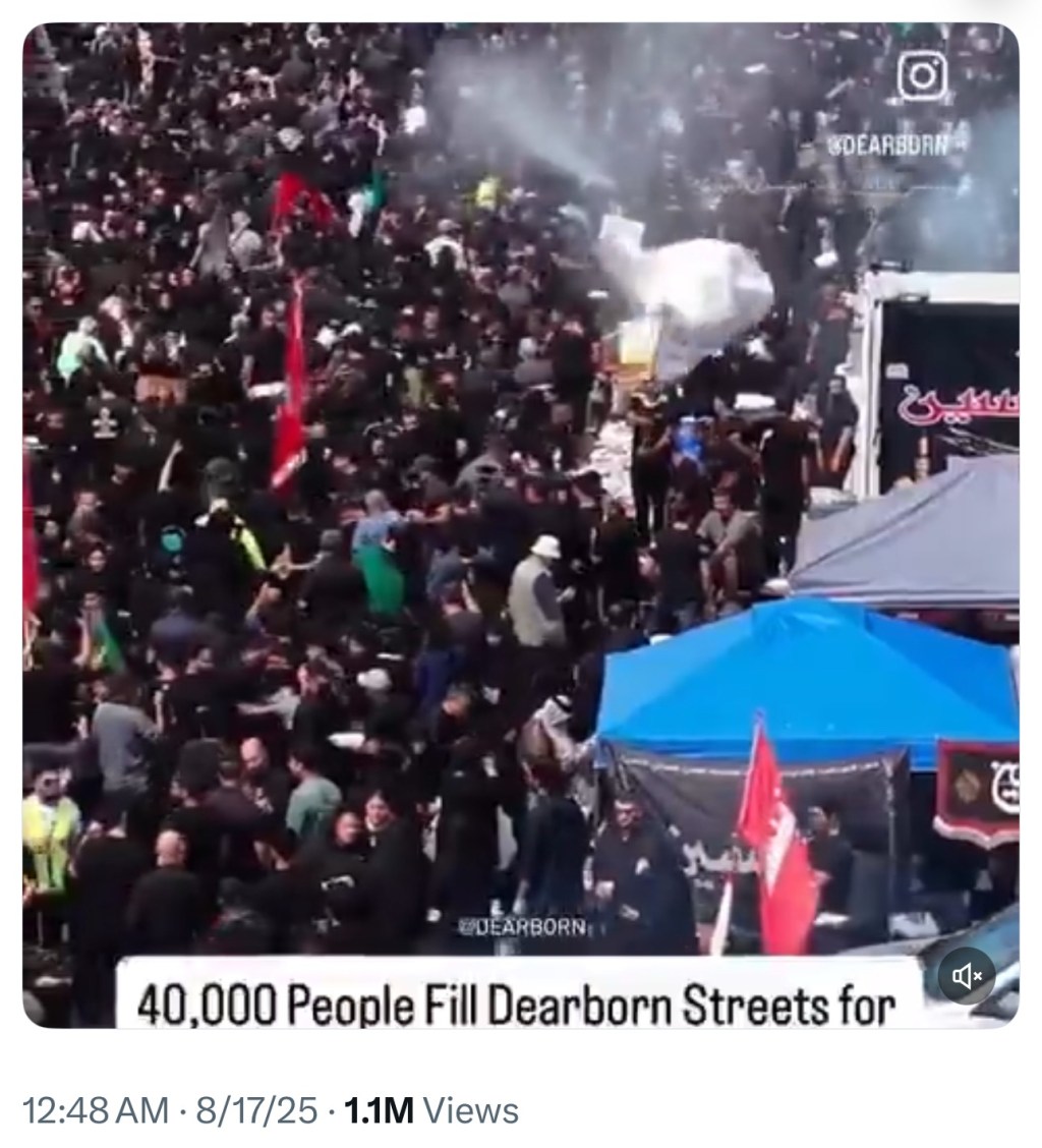 Dearborn, Mich. — Tens of thousands of Muslims gathered for a Shia Islamic march and procession. pic.twitter.com/BqYN9pkI8J— Andy Ngo (@MrAndyNgo) August 17, 2025