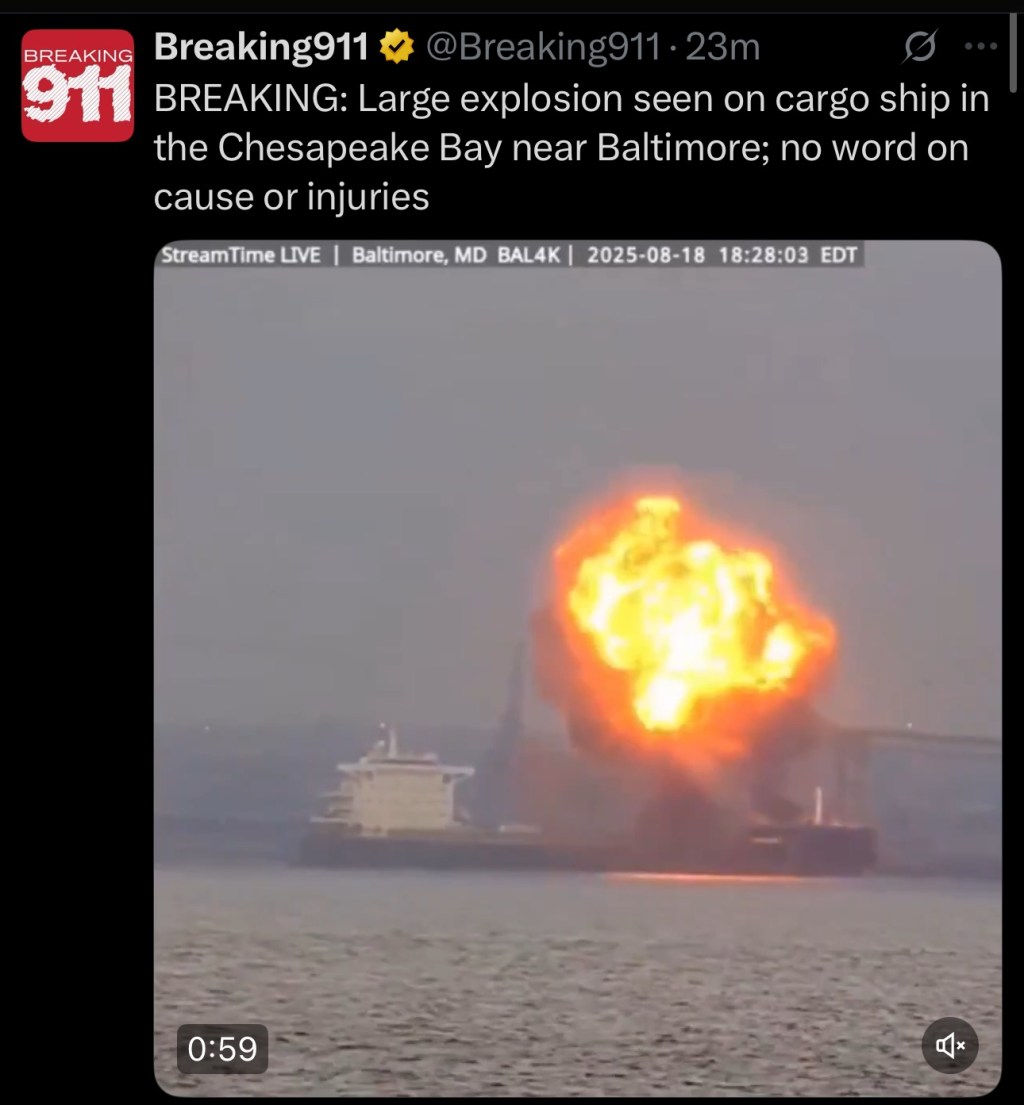 BREAKING: Large explosion seen on cargo ship in the Chesapeake Bay near Baltimore; no word on cause or injuries pic.twitter.com/vOPOj7JTgd— Breaking911 (@Breaking911) August 18, 2025