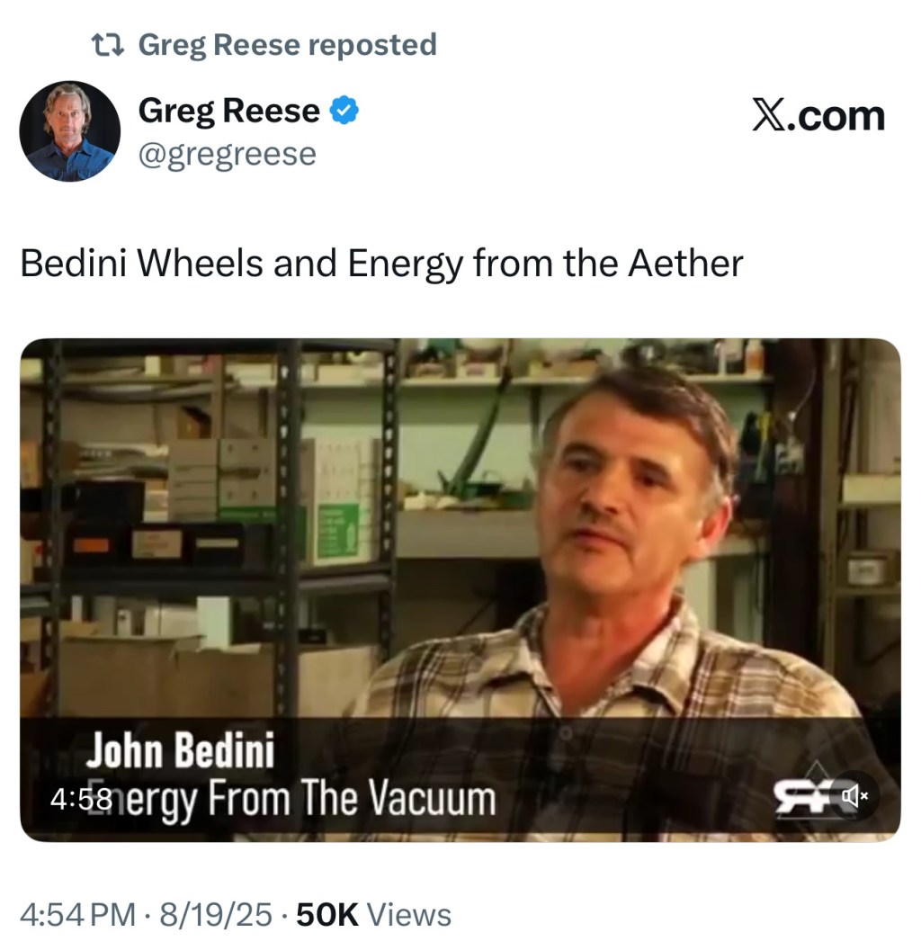 Bedini Wheels and Energy from the Aether pic.twitter.com/0ggcGerv5X— Greg Reese (@gregreese) August 19, 2025