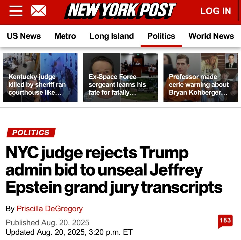 A Manhattan federal judge turned aside the Trump administration’s attempt to release grand jury testimony in the federal case against late pedophile Jeffrey Epstein Wednesday, calling the effort a “diversion” from the fact the feds haven’t followed through on a promise to release outstanding files on the matter.