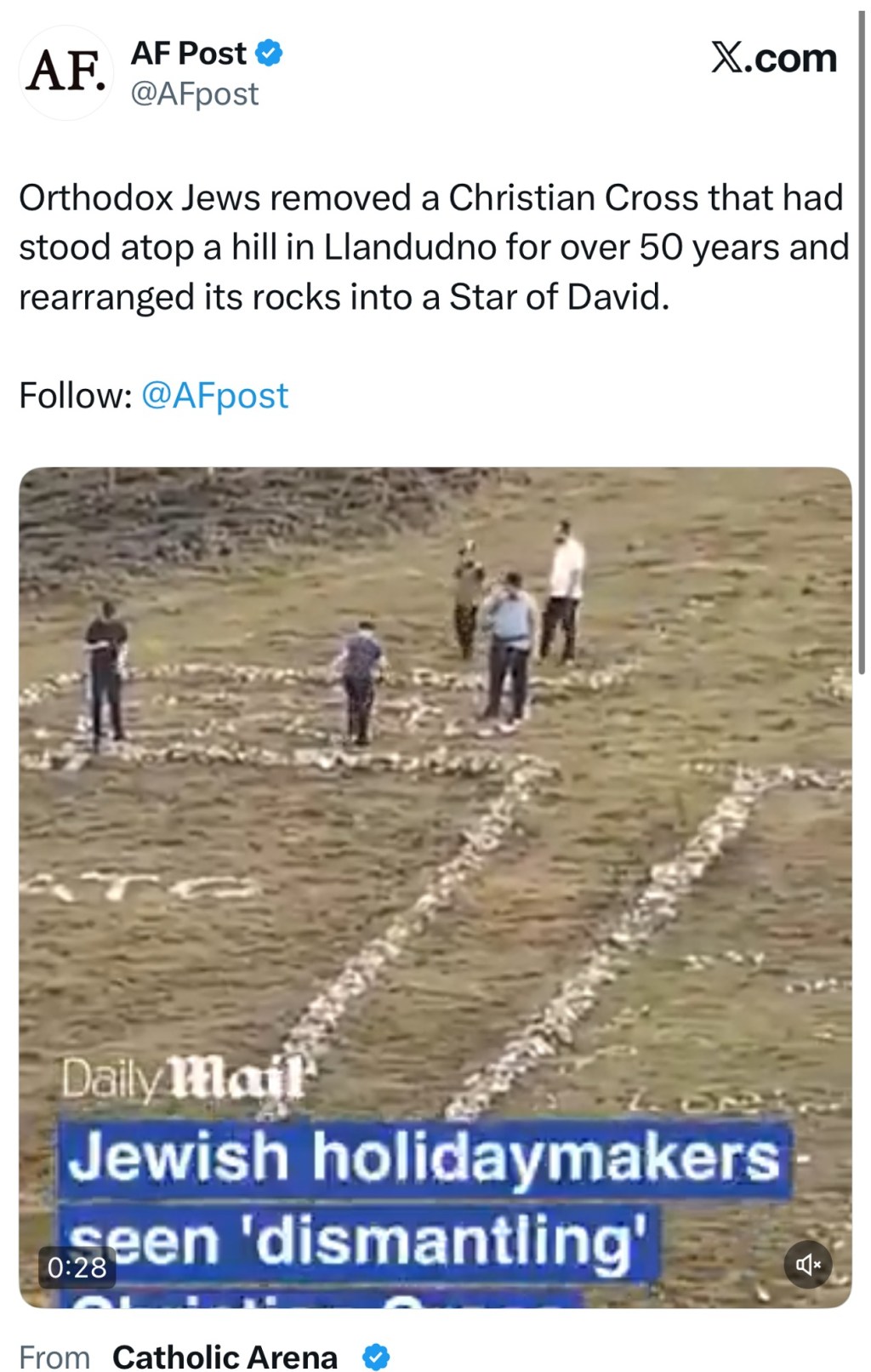 WALES Orthodox Jews have DISMANTLED a CROSS which had been atop a hill in Llandudno for 50 YEARS The THUGS then rearranged the Cross into a STAR OF DAVID pic.twitter.com/32s7kgheDo— Catholic Arena (@CatholicArena) August 20, 2025