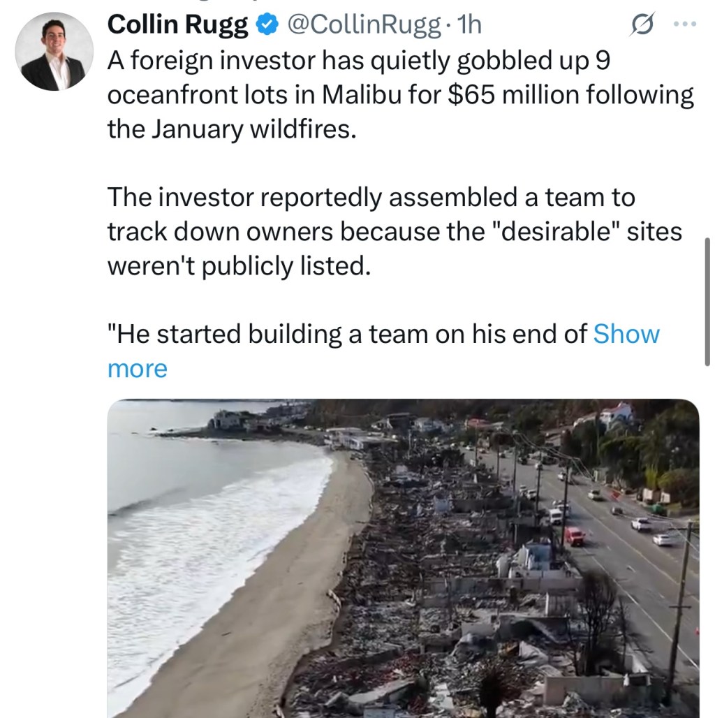 A foreign investor has quietly gobbled up 9 oceanfront lots in Malibu for $65 million following the January wildfires.