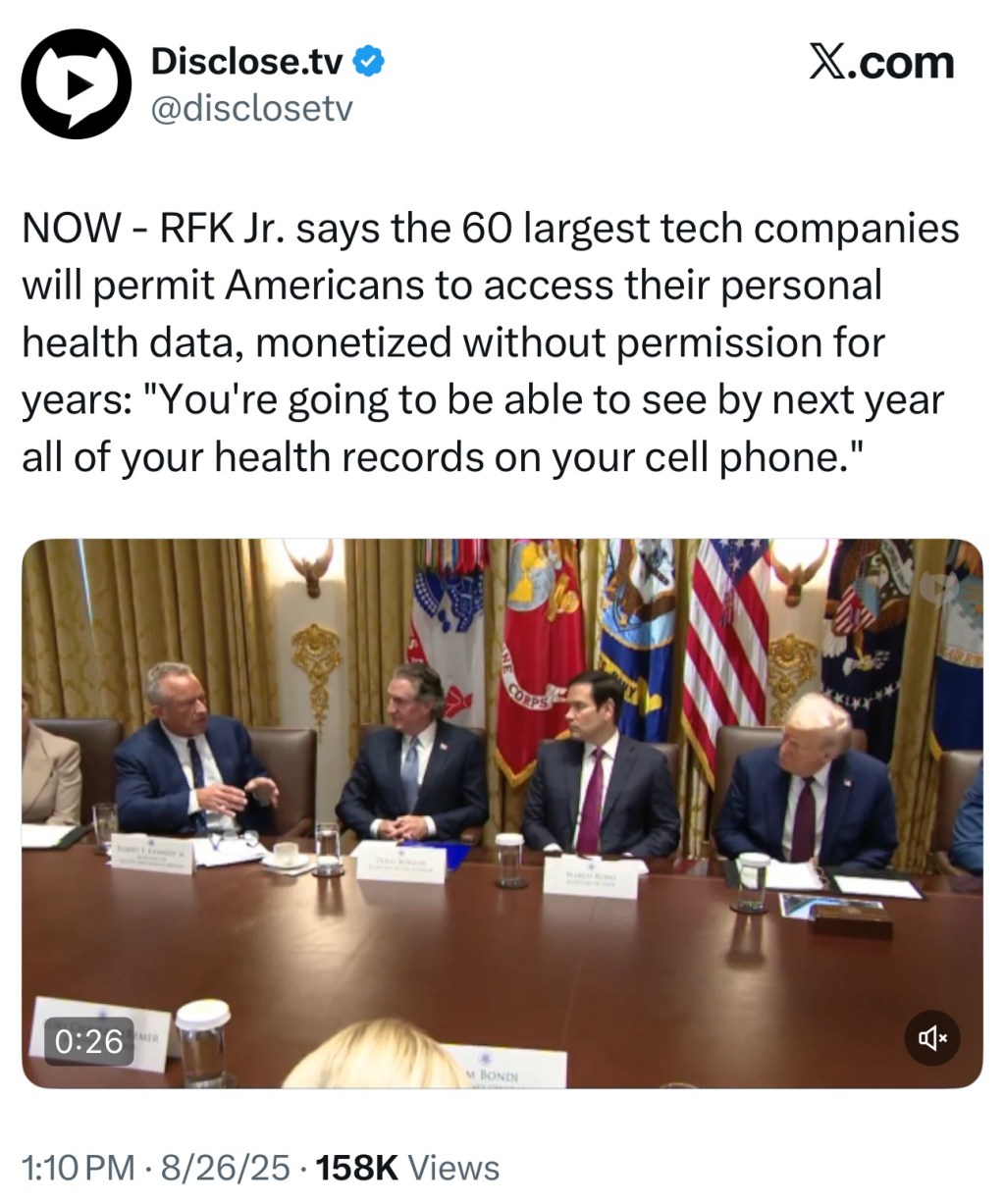 NOW – RFK Jr. says the 60 largest tech companies will permit Americans to access their personal health data, monetized without permission for years: "You're going to be able to see by next year all of your health records on your cell phone." pic.twitter.com/Wa9eZhrbkg