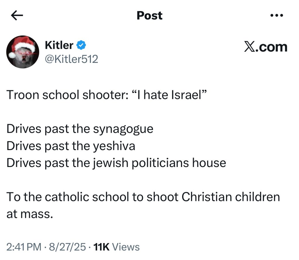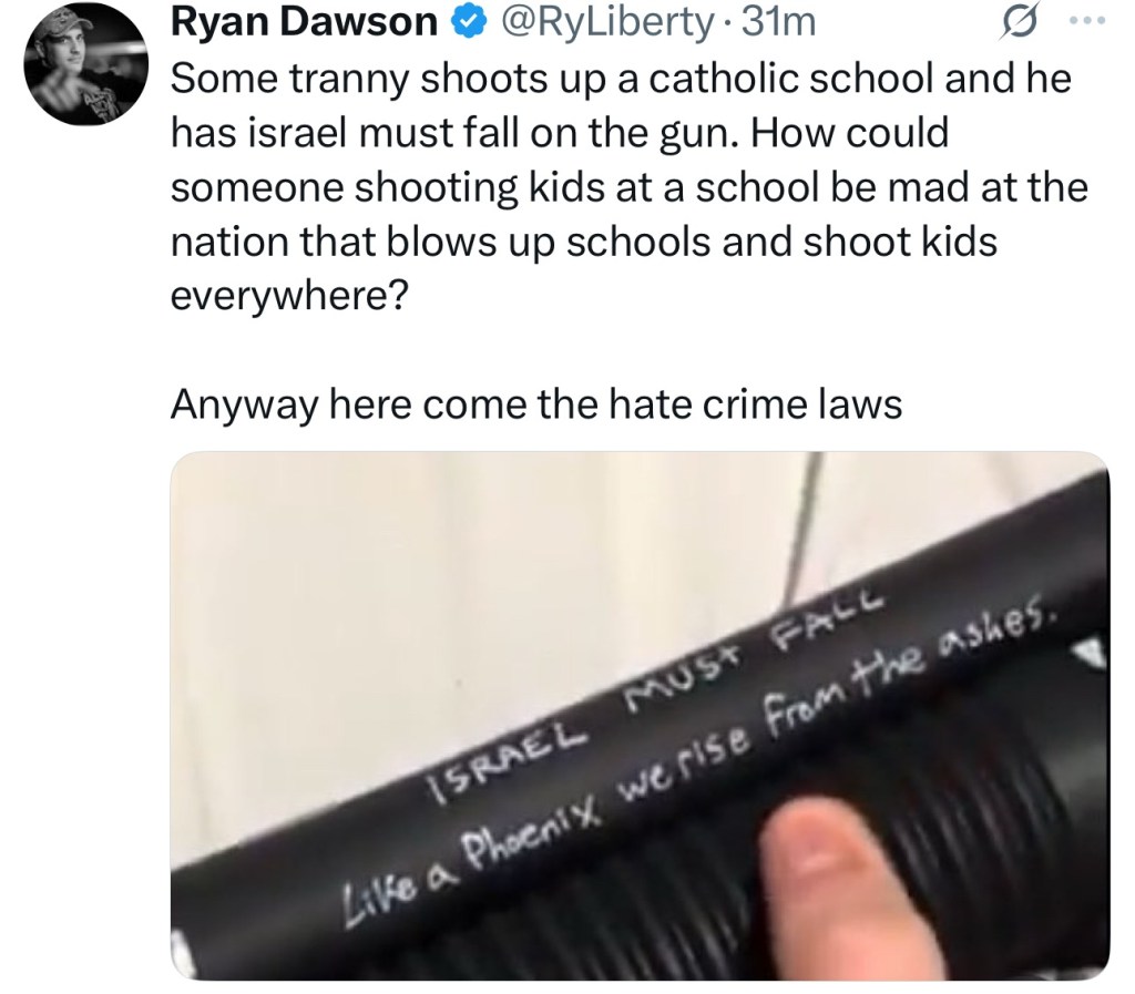 BREAKING: The Minneapolis shooter wrote “burn Israel” and “Israel must fall” on his rifle.