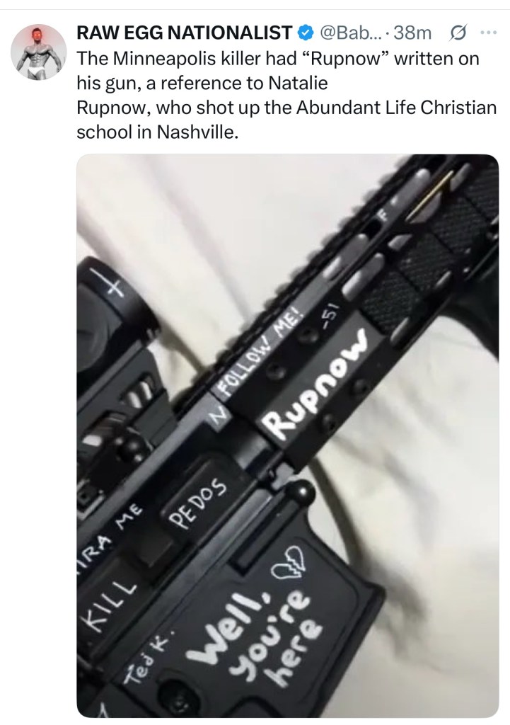 BREAKING – The suspect in the Minneapolis, Minnesota, shooting at a Catholic school and church has been identified as Robin Westman, who posted a manifesto on social media just two hours ago, including a video showing the words “kill Donald Trump” written on a gun. pic.twitter.com/Aqfr5eNea0