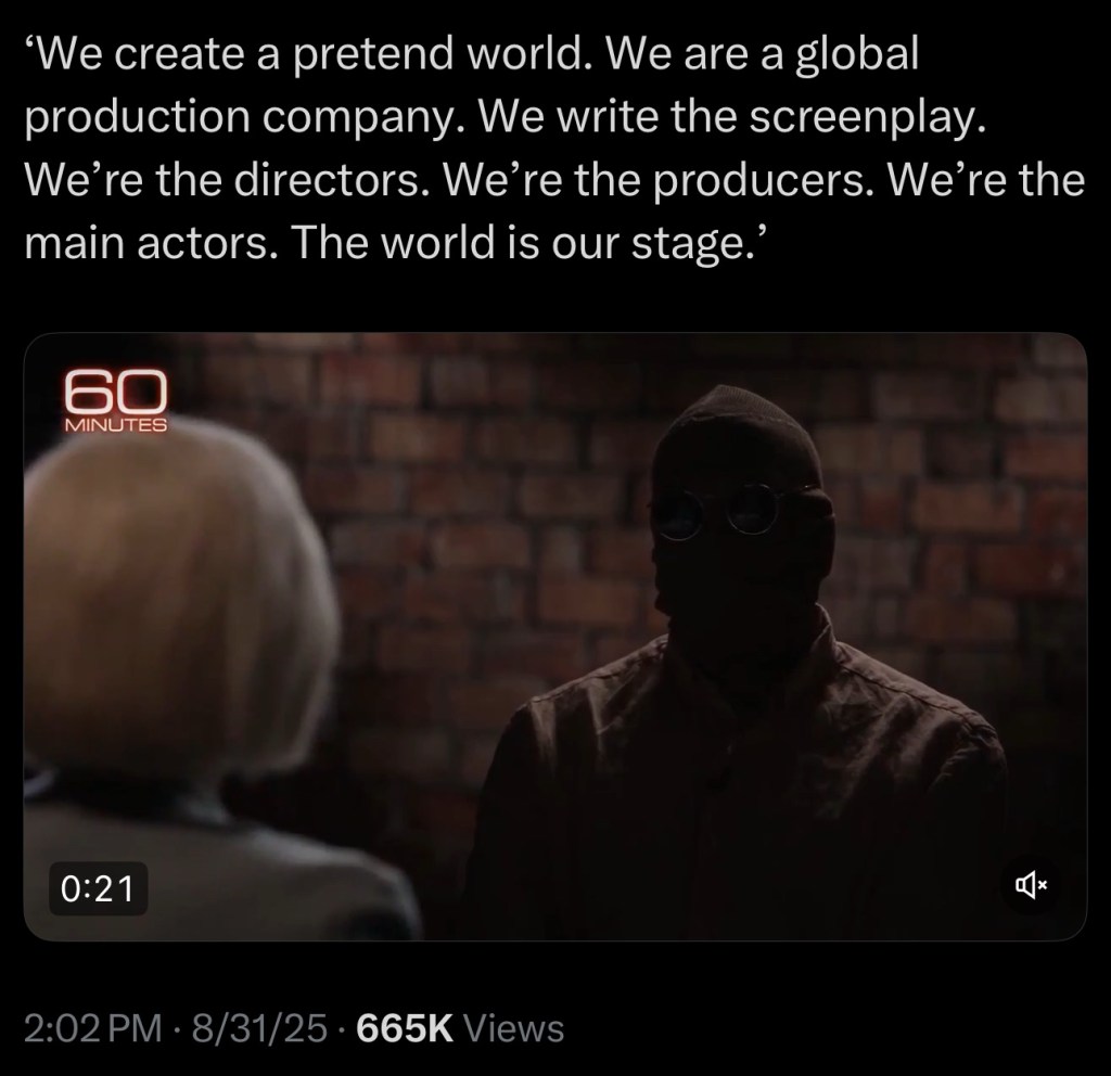 ‘We create a pretend world. We are a global production company. We write the screenplay. We’re the directors. We’re the producers. We’re the main actors. The world is our stage.’