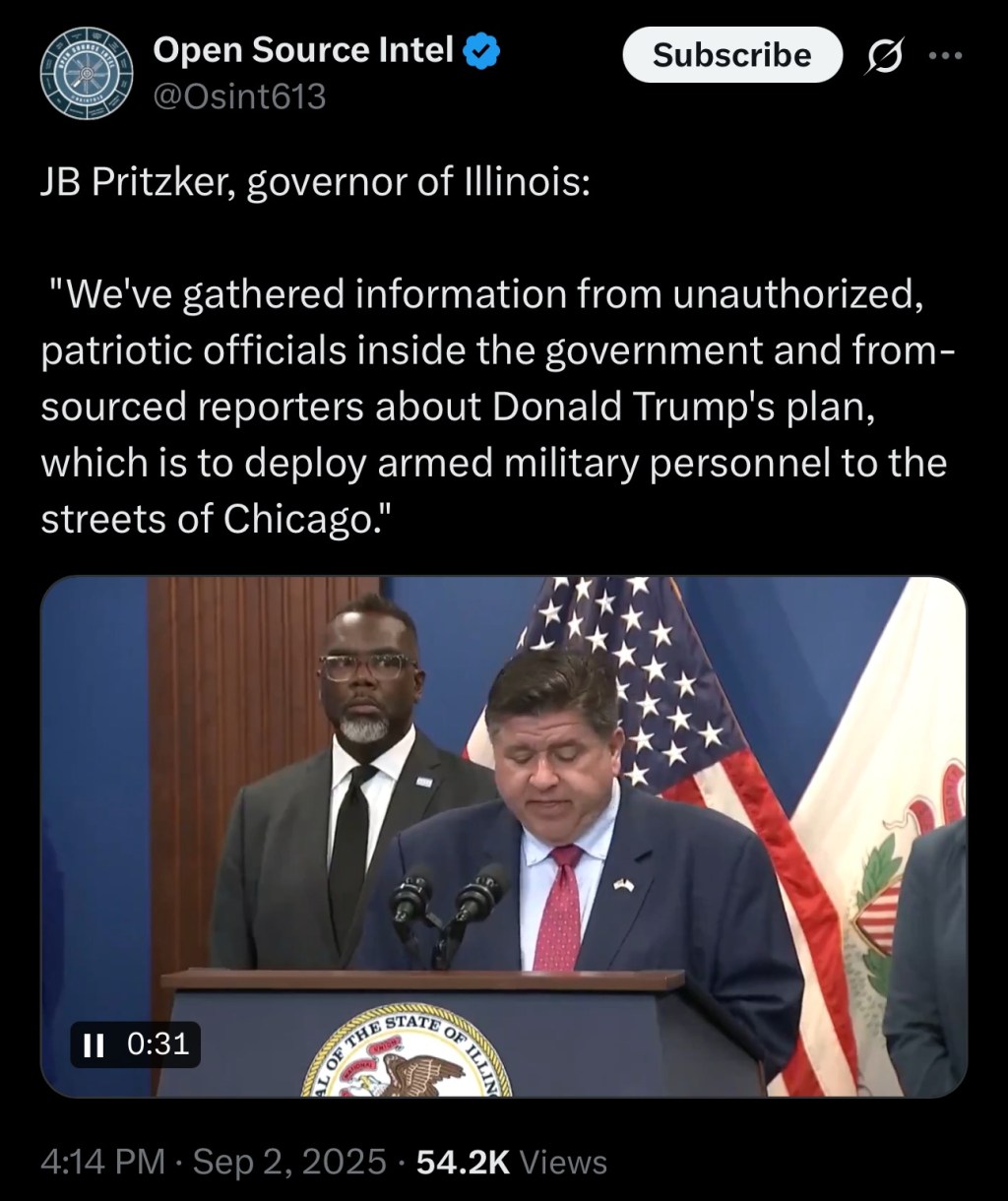 "We've gathered information from unauthorized, patriotic officials inside the government and from-sourced reporters about Donald Trump's plan, which is to deploy armed military personnel to the streets of Chicago." pic.twitter.com/5xU4L0KNat