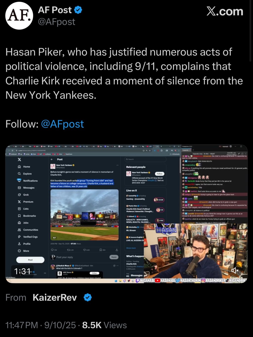 Hasan Piker, who has justified numerous acts of political violence, including 9/11, complains that Charlie Kirk received a moment of silence from the New York Yankees.