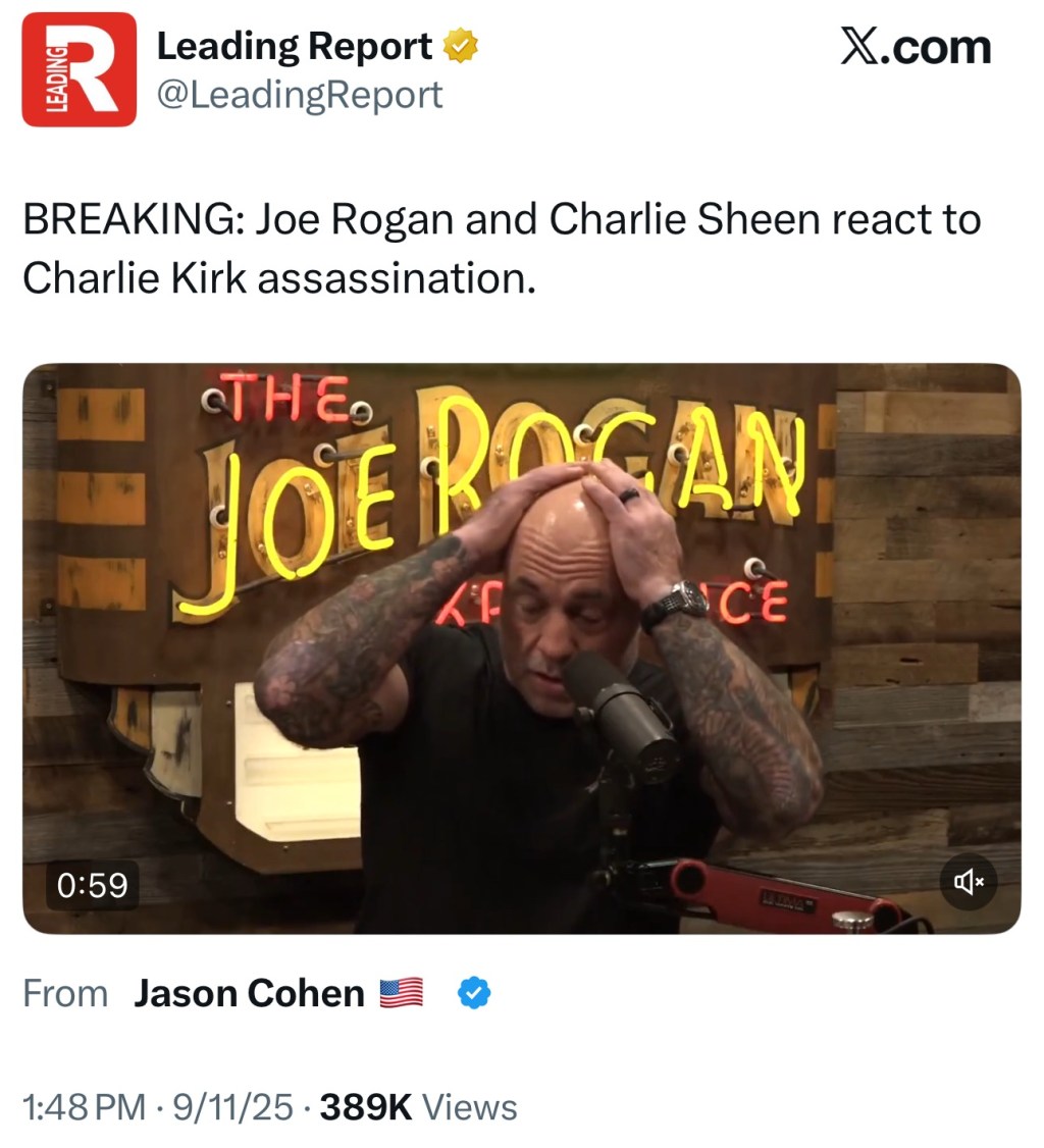 BREAKING: Joe Rogan and Charlie Sheen react to Charlie Kirk assassination. pic.twitter.com/b0yt1WQwaq— Leading Report (@LeadingReport) September 11, 2025