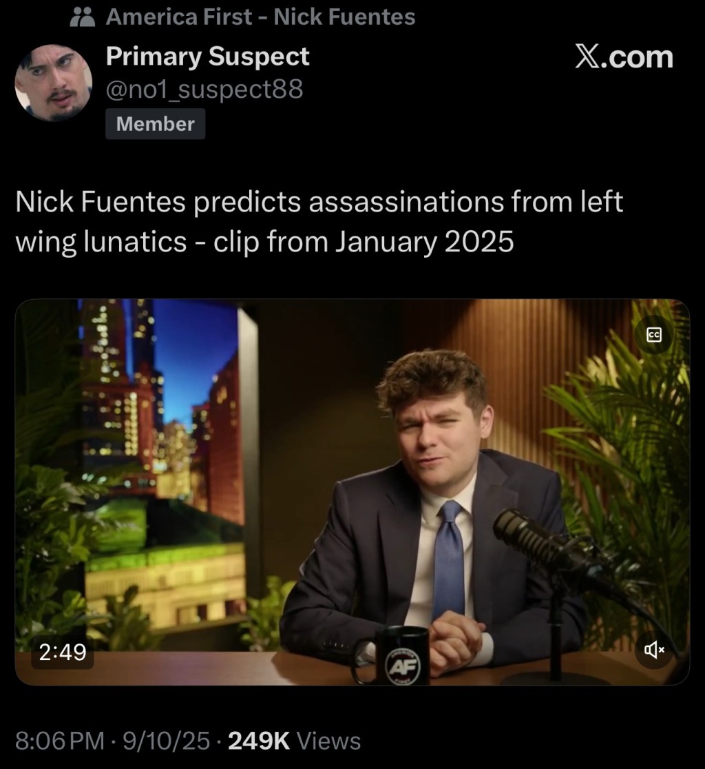 Nick Fuentes predicts assassinations from left wing lunatics – clip from January 2025 pic.twitter.com/reb5gBTQj0