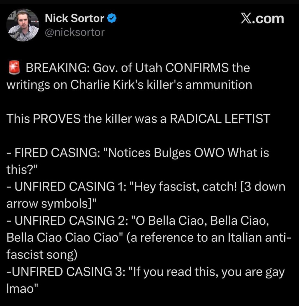 BREAKING: 🚨 Bullet casing found in Kirk ass-ssination investigation had "HEY FACIST, CATCH" written on it along with an Antifa symbol.pic.twitter.com/002QPQhvqu— E X X ➠A L E R T S (@ExxAlerts) September 12, 2025