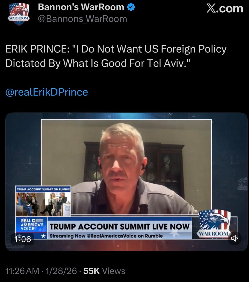 Erik Prince on Bannon’s War Room: "I do not want US foreign policy dictated by what is good for Tel Aviv."