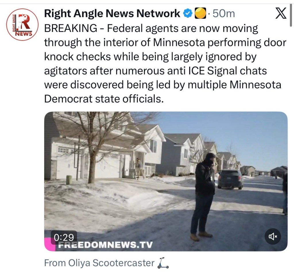 BREAKING – Federal agents are now moving through the interior of Minnesota performing door knock checks while being largely ignored by agitators after numerous anti ICE Signal chats were discovered being led by multiple Minnesota Democrat state officials.pic.twitter.com/lOGOArTy1Q