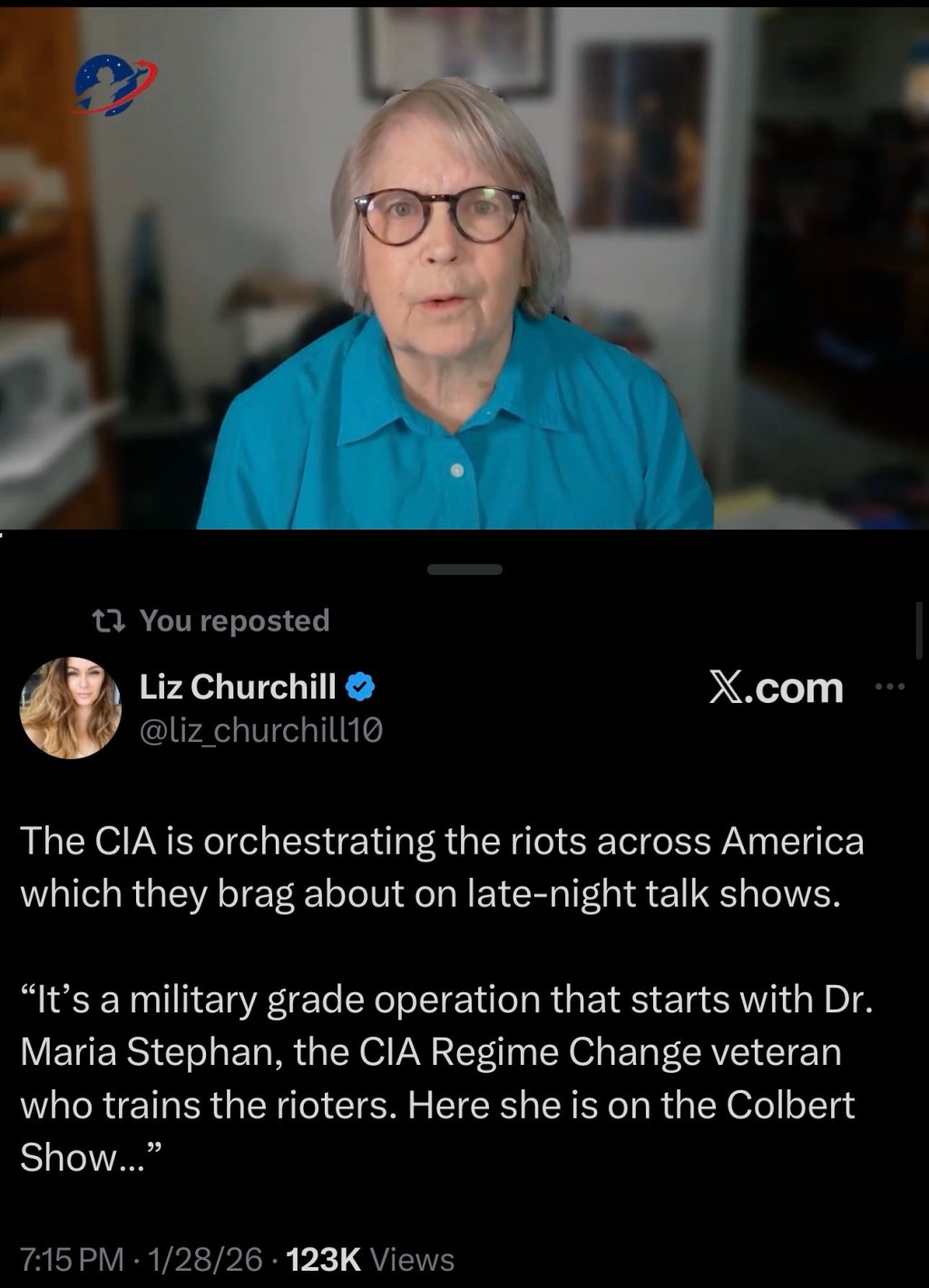 “It’s a military grade operation that starts with Dr. Maria Stephan, the CIA Regime Change veteran who trains the rioters. Here she is on the Colbert Show…”