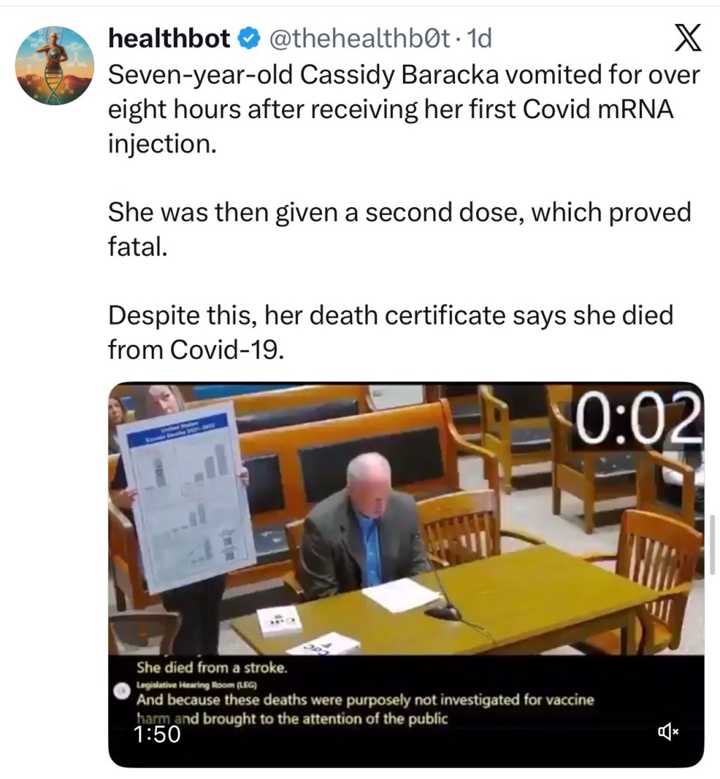 Seven-year-old Cassidy Baracka vomited for over eight hours after receiving her first Covid mRNA injection.