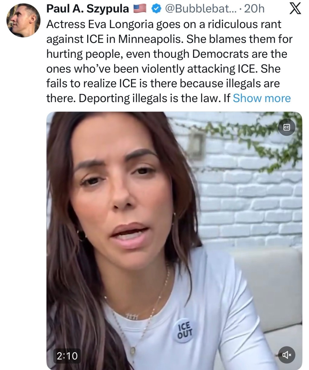 Actress Eva Longoria goes on a ridiculous rant against ICE in Minneapolis. She blames them for hurting people, even though Democrats are the ones who’ve been violently attacking ICE. She fails to realize ICE is there because illegals are there. Deporting illegals is the law. If… pic.twitter.com/iv3E8eLm1R
