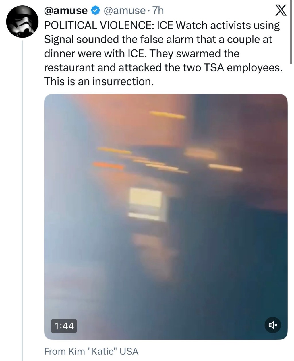 POLITICAL VIOLENCE: ICE Watch activists using Signal sounded the false alarm that a couple at dinner were with ICE. They swarmed the restaurant and attacked the two TSA employees. This is an insurrection. pic.twitter.com/hbklP4O9Ae