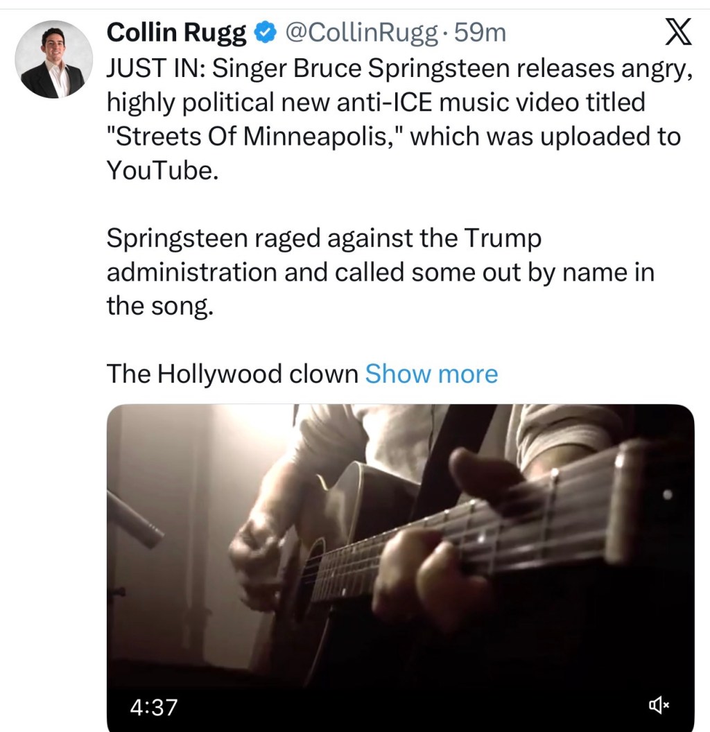 JUST IN: Singer Bruce Springsteen releases angry, highly political new anti-ICE music video titled "Streets Of Minneapolis," which was uploaded to YouTube.