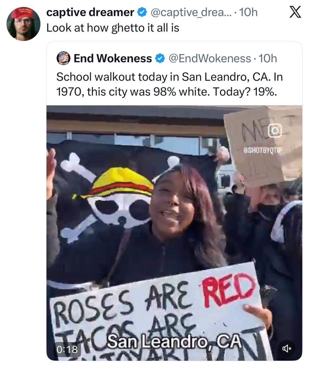 School walkout today in San Leandro, CA. In 1970, this city was 98% white. Today? 19%. pic.twitter.com/AfdUOSsF5Y