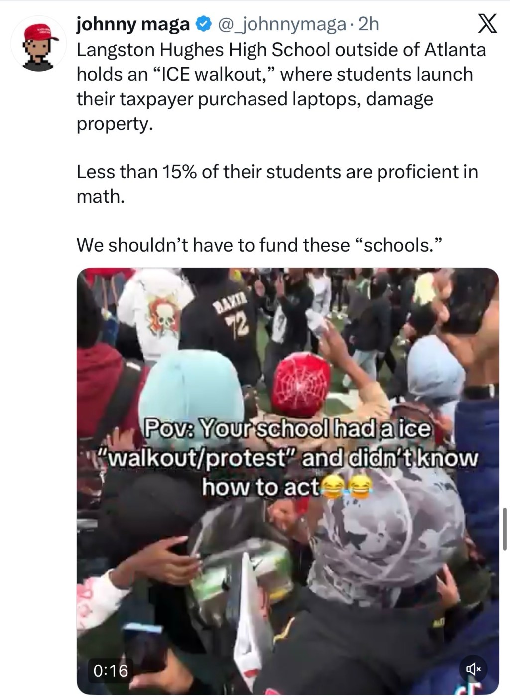 Langston Hughes High School outside of Atlanta holds an “ICE walkout,” where students launch their taxpayer purchased laptops, damage property.