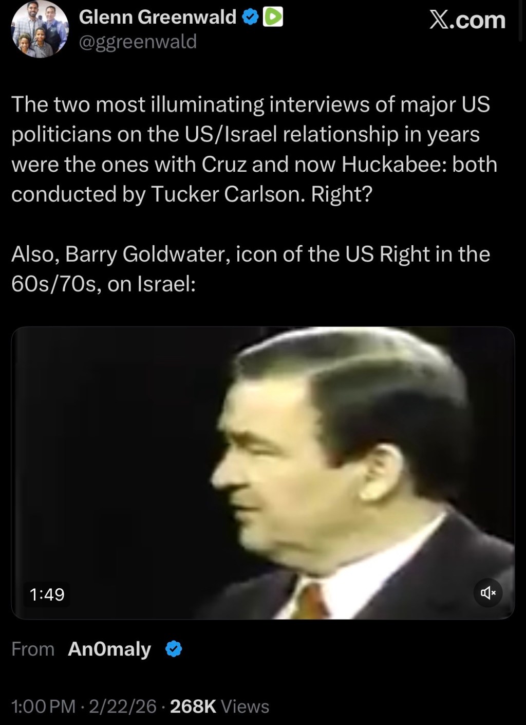 The two most illuminating interviews of major US politicians on the US/Israel relationship in years were the ones with Cruz and now Huckabee: both conducted by Tucker Carlson. Right?