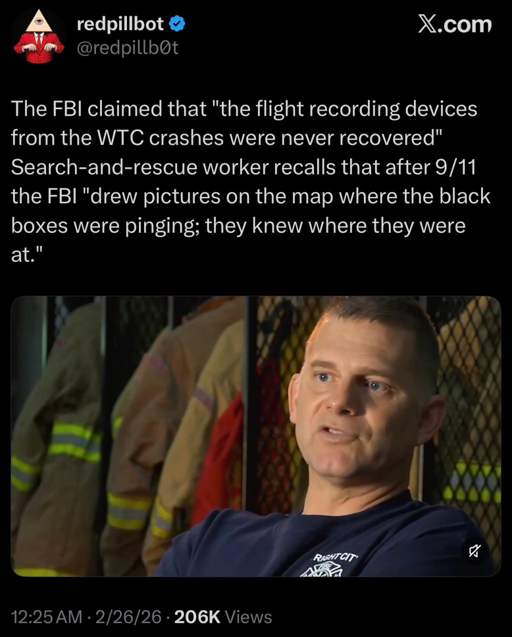 Search-and-rescue worker recalls that after 9/11 the FBI “drew pictures on the map where the black boxes were pinging; they knew where they were at.”