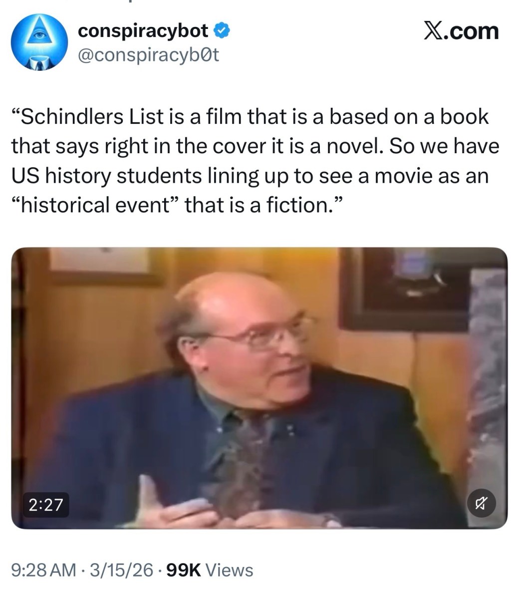 “Schindlers List is a film that is a based on a book that says right in the cover it is a novel. So we have US history students lining up to see a movie as an “historical event” that is a fiction.” pic.twitter.com/oXZ1UrgDGM