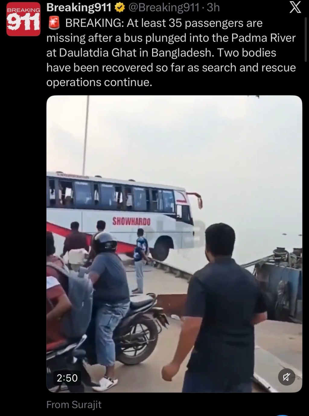 🚨 BREAKING: At least 35 passengers are missing after a bus plunged into the Padma River at Daulatdia Ghat in Bangladesh. Two bodies have been recovered so far as search and rescue operations continue.