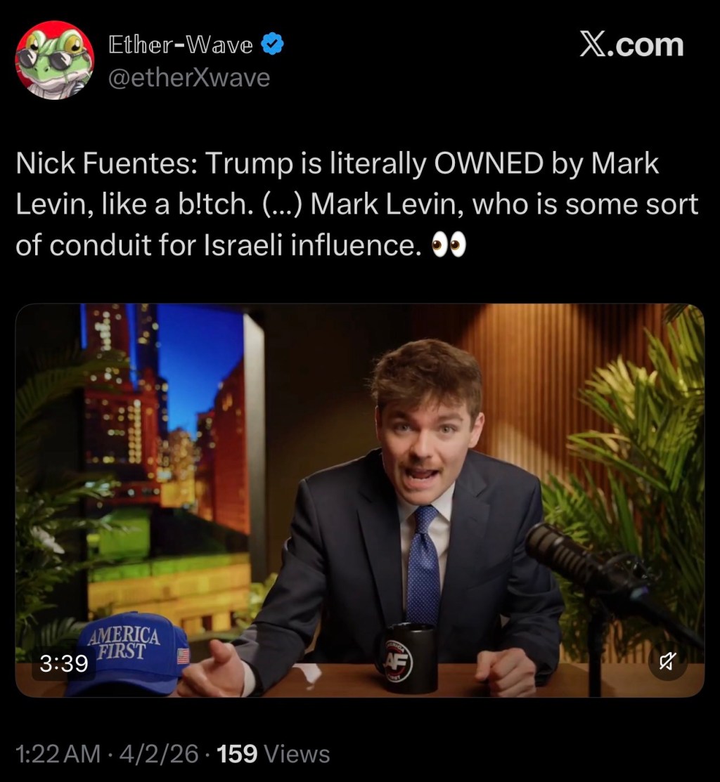 Nick Fuentes: Trump is literally OWNED by Mark Levin, like a b!tch. (…) Mark Levin, who is some sort of conduit for Israeli influence. 👀 pic.twitter.com/QT0ITtTLY8