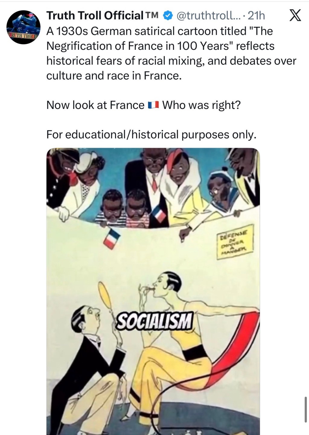 A 1930s German satirical cartoon titled "The Negrification of France in 100 Years" reflects historical fears of racial mixing, and debates over culture and race in France.