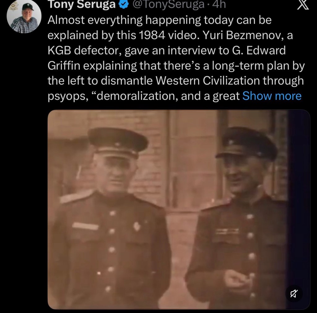Almost everything happening today can be explained by this 1984 video. Yuri Bezmenov, a KGB defector, gave an interview to G. Edward Griffin explaining that there’s a long-term plan by the left to dismantle Western Civilization through psyops, “demoralization, and a great brainwashing.”